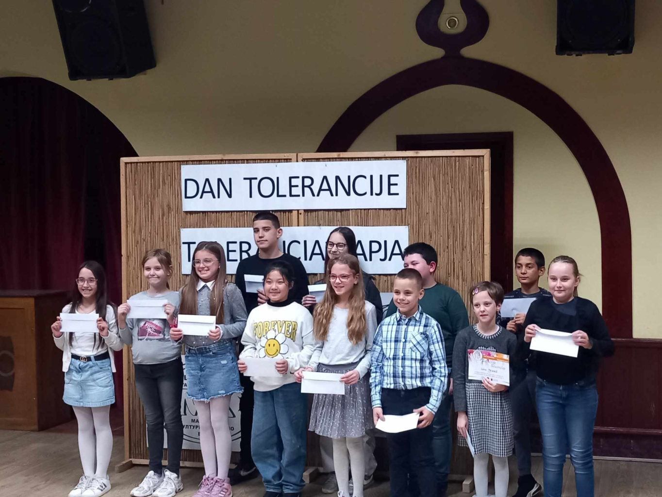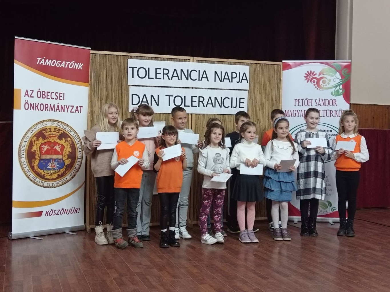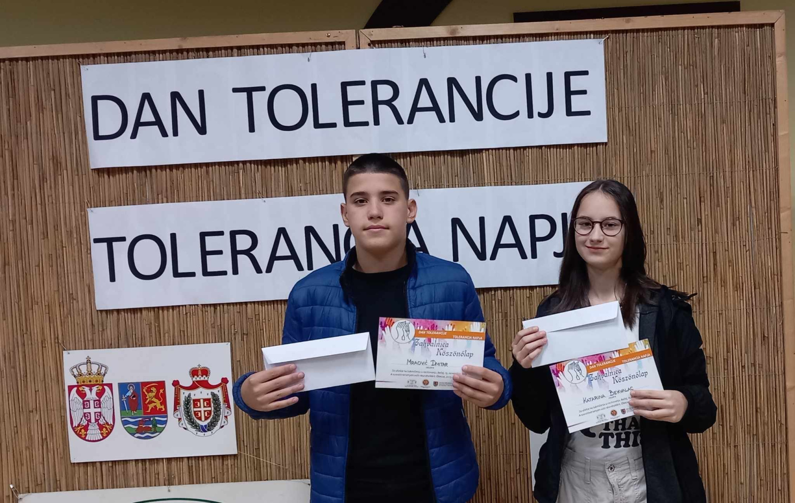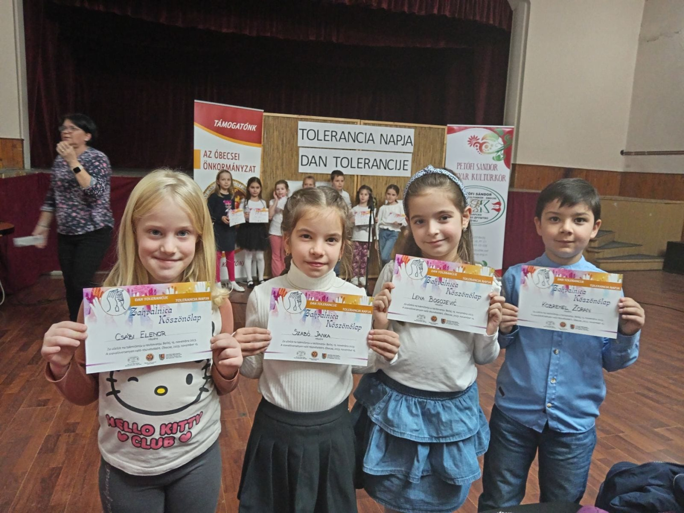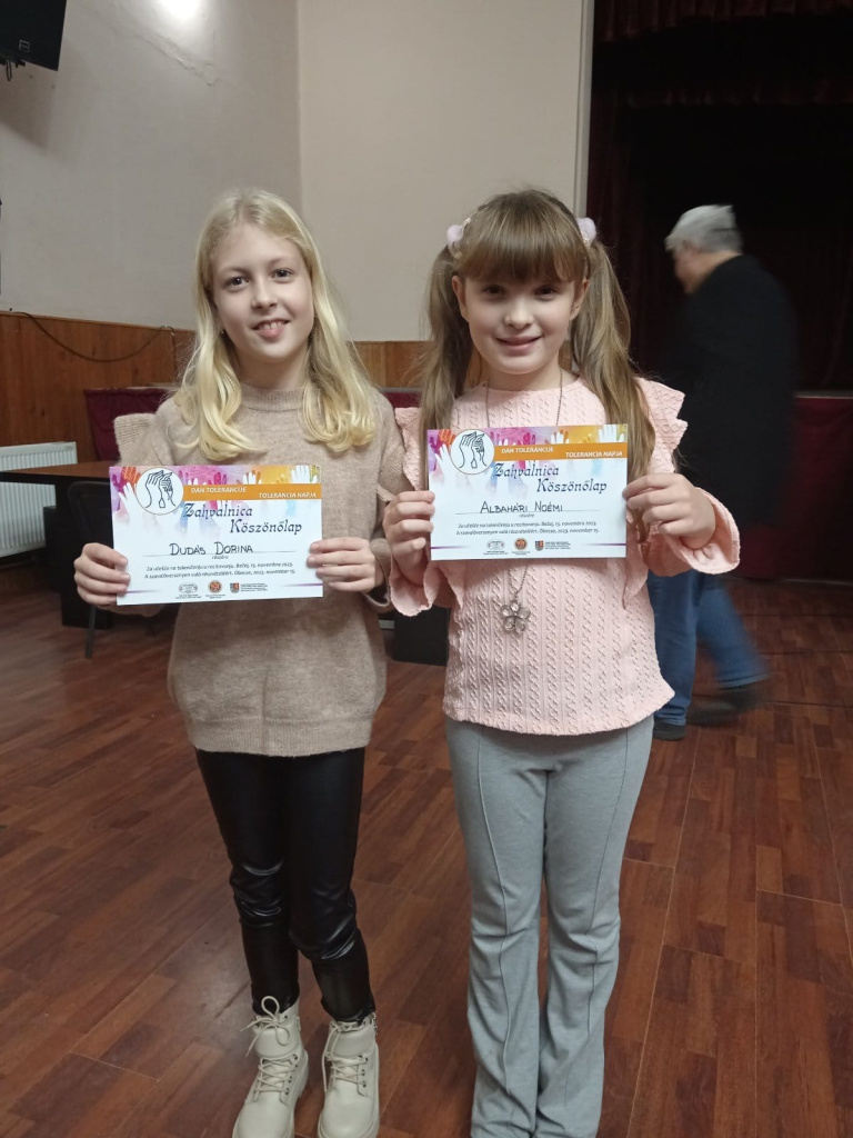 A Petőfi Sándor Magyar Kultúrkör által szervezett Tolerancia-napi szavalóversenyen, ahol közel száz szavaló mérettette meg magát, tanulóink kiváló eredményeket értek el. A magyar nyelven tanuló diákok szerb nyelven mondtak verset és a következő eredményeket érték el: Szabó Janka 1.1, 2. hely Bogojević Lena 1.1, 1. hely Albahári Noémi 3.1, 2. hely Dudás Dorina 3.1, 1. hely Balogh Ilijána 5.1, 2. hely A szerb nyelven tanuló diákok magyar nyelven mondtak verset és a következő eredményeket érték el: Dmitar Mraović 8.2 3. hely Katarina Bekvalac 7.2 1. hely Akik még részt vettek: Jović Vukašin 3.3 Popović Višnja 3.3 Stepanov Maja 3.3 Skakić Ljubica 3.3 Sara Rigovljev 4.3 Lana Glišin 4.3 Jovan Gospić 8.2 Felkészítő tanárok: Jaćović Tanjának, Dujaković Dajanának és Kutika Magyar Klementinának! Povodom međunarodnog dana tolerancije, učenici naše škole su u prepunoj sali MKD "Petefi Šandor" osvojili brojne nagrade! Učenici mađarskog maternjeg jezika su recitacijama na srpskom jeziku osvojili sledeće nagrade: Janka Sabo 1.1, osvojeno drugo mesto. Lena Bogojević 1.1, osvojeno prvo mesto. Noemi Albahari 3.1, osvojeno drugo mesto. Dorina Dudaš 3.1, osvojeno prvo mesto. Ilijana Balog 5.1, osvojeno drugo mesto. Učenici srpskog maternjeg jezika su recitacijama na mađarskom jeziku osvojili sledeće nagrade: Dmitar Mraovic 8.2, osvojeno treće mesto Katarina Bekvalac 7.2, osvojeno prvo mesto Učenici koji su takođe učestvovali su Vukašin Jović 3.3 , Višnja Popović 3.3, Maja Stepanov 3.3, Ljubica Skakić 3.3, Rigovljev Sara 4.3, Lana Glišin 4.3, Jovan Gospić 8.2, Blanka Tripolski 8.1, Zoran Kobrehel 1.1 i Elenor Čabi 1.1. Pripremale su ih nastavnice: Tanja Jaćović, Dajana Dujaković i Kutika Mađar Klementina.